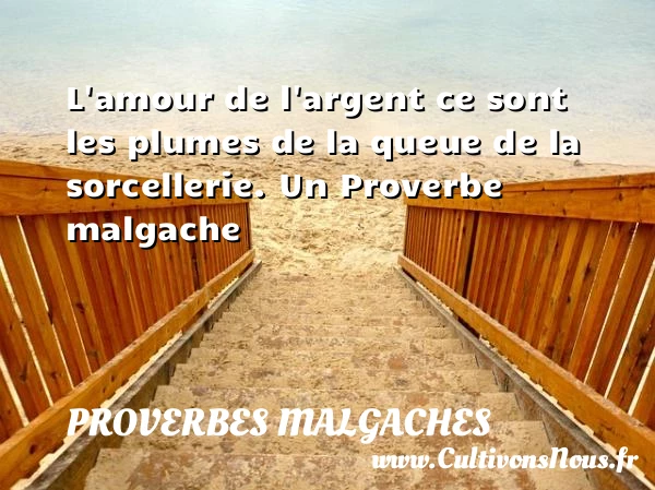 Evaluer cet article L’amour de l’argent ce sont les plumes de la queue de la sorcellerie. Un Proverbe malgache A lire Nier l'existence de Dieu, c'est sauter les yeux PARTAGER Tags: Proverbes philosophiques