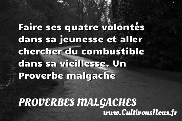 Evaluer cet article Faire ses quatre volontés dans sa jeunesse et aller chercher du combustible dans sa vieillesse. Un Proverbe malgache A lire La terre est une grande marmite, et les hommes PARTAGER Tags: Proverbes philosophiques