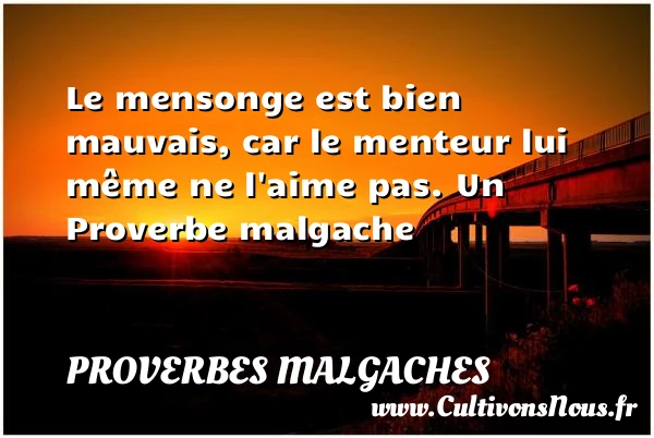 Evaluer cet article Le mensonge est bien mauvais, car le menteur lui même ne l’aime pas. Un Proverbe malgache A lire Sept enfants ne retiendront PARTAGER Tags: Proverbes philosophiques