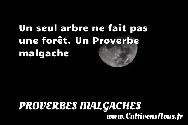 Evaluer cet article Un seul arbre ne fait pas une forêt. Un Proverbe malgache A lire Des poissons qui sont dans une même marmite, on ne PARTAGER Tags: Proverbes philosophiques