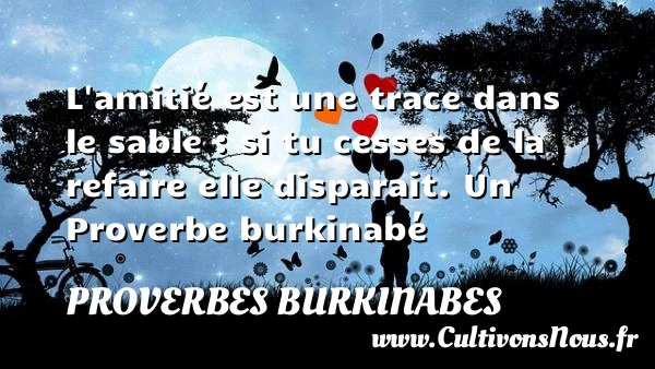 Evaluer cet article L’amitié est une trace dans le sable : si tu cesses de la refaire elle disparait. Un Proverbe burkinabé A lire L'éléphant est grand mais son enfant est petit. PARTAGER Tags: Proverbes philosophiquesProverbes vie