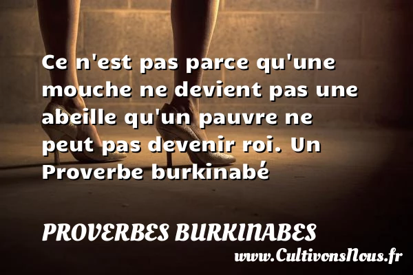 Evaluer cet article Ce n’est pas parce qu’une mouche ne devient pas une abeille qu’un pauvre ne peut pas devenir roi. Un Proverbe burkinabé A lire Il est plus facile de détourner le méchant de son amour PARTAGER Tags: Proverbes philosophiques
