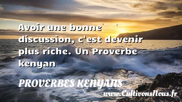 Evaluer cet article Avoir une bonne discussion, c’est devenir plus riche. Un Proverbe kenyan A lire Si le babouin pouvait voir son derrière, lui aussi PARTAGER Tags: Proverbes funProverbes philosophiques