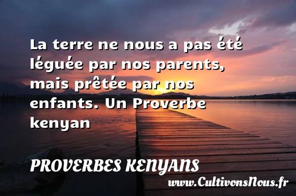 Evaluer cet article La terre ne nous a pas été léguée par nos parents, mais prêtée par nos enfants. Un Proverbe kenyan A lire Traverse la rivière avant d'insulter le crocodile. PARTAGER Tags: Proverbes philosophiques