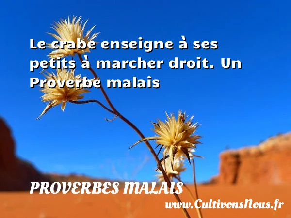 Evaluer cet article Le crabe enseigne à ses petits à marcher droit. Un Proverbe malais A lire Dans une petite église, un petit saint est PARTAGER Tags: Proverbes philosophiques