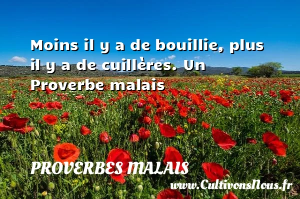 Evaluer cet article Moins il y a de bouillie, plus il y a de cuillères. Un Proverbe malais A lire S'il a de longues cornes, on se méfiera PARTAGER Tags: Proverbes philosophiques