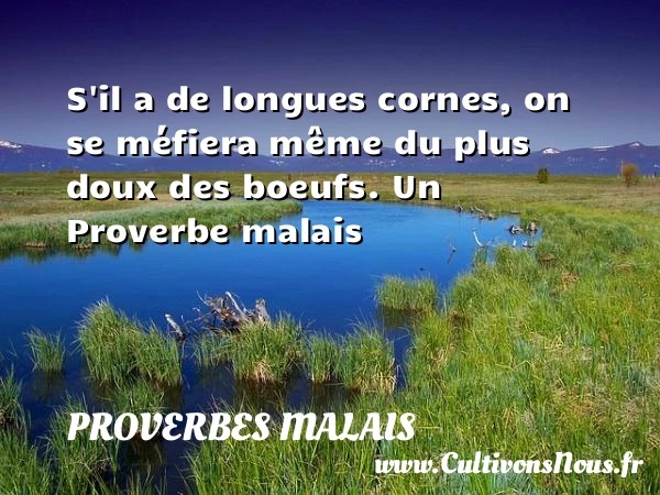 Evaluer cet article S’il a de longues cornes, on se méfiera même du plus doux des boeufs. Un Proverbe malais A lire La bonne semence, même si elle tombe dans PARTAGER Tags: Proverbes philosophiques
