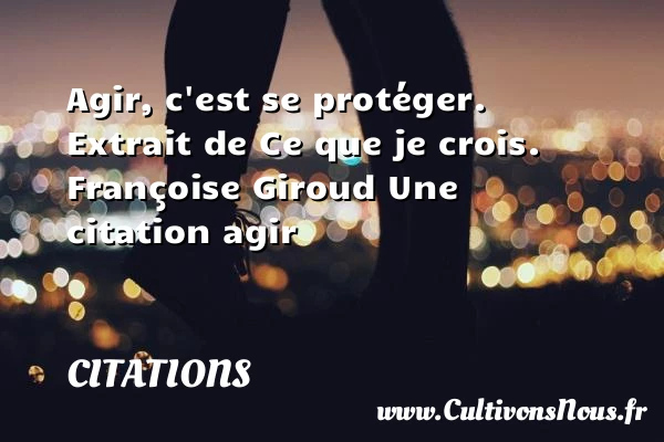 Evaluer cet article Agir, c’est se protéger. Extrait de Ce que je crois. Françoise Giroud Une citation agir A lire Le sage, sans agir, oeuvre. PARTAGER Tags: Citation agir