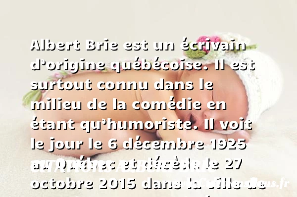 Albert Brie est un écrivain d’origine québécoise. Il est surtout connu dans le milieu de la comédie en étant qu’humoriste. Il voit le jour le 6 décembre 1925 au Québec et décède le 27 octobre 2015 dans la ville de Beloeil, dans le comté de La Vallée-du-Richelieu, au Canada. Son humour touche aussi bien la philosophie que la littérature et il aimait les exprimer sous forme d’aphorismes plein d’originalité.