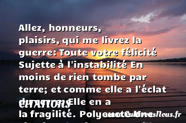 Allez, honneurs, plaisirs, qui me livrez la guerre: Toute votre félicité Sujette à l’instabilité En moins de rien tombe par terre; et comme elle a l’éclat du verre, Elle en a la fragilité.