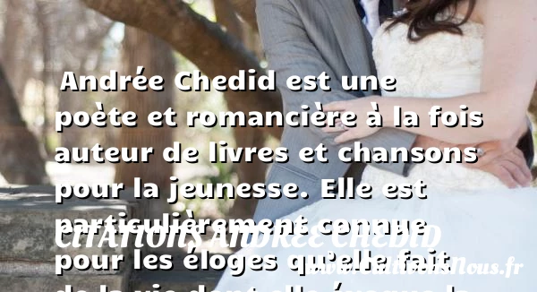 Andrée Chedid est une poète et romancière à la fois auteur de livres et chansons pour la jeunesse. Elle est particulièrement connue pour les éloges qu’elle fait de la vie dont elle évoque la fragilité dans ses œuvres. Très attentive à la condition humaine, notamment les liens entre les hommes et le monde, elle a écrit de nombreuses œuvres qui lui ont valu des récompenses en littérature.