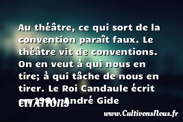 Evaluer cet article Au théâtre, ce qui sort de la convention paraît faux. Le théâtre vit de conventions. On en veut à qui nous en tire; à qui tâche de nous en tirer. Le Roi Candaule écrit en 1901. André Gide A lire Depuis deux mille ans n'a PARTAGER