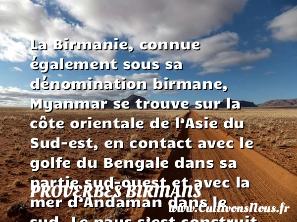 La Birmanie, connue également sous sa dénomination birmane, Myanmar se trouve sur la côte orientale de l’Asie du Sud-est, en contact avec le golfe du Bengale dans sa partie sud-ouest et avec la mer d’Andaman dans le sud. Le pays s’est construit autour de plusieurs pouvoirs militaires à partir de 1962. Après la décision de l’Union Européenne et des Etats-Unis quant à l’annulation de l’embargo en 2012, le pays est de nouveau ouvert au reste du monde.
