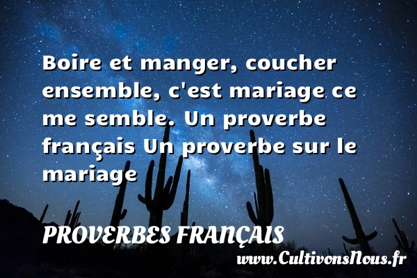Evaluer cet article Boire et manger, coucher ensemble, c’est mariage ce me semble. Un proverbe français Un proverbe sur le mariage A lire La vie se passe tout entière PARTAGER Tags: Proverbe boireProverbes mariage