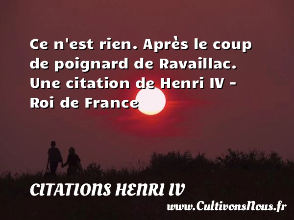 Evaluer cet article Ce n’est rien. Après le coup de poignard de Ravaillac. Une citation de Henri IV – Roi de France A lire Un peuple, c'est une bête PARTAGER
