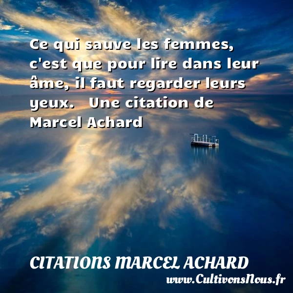 Evaluer cet article Ce qui sauve les femmes, c’est que pour lire dans leur âme, il faut regarder leurs yeux. Une citation de Marcel Achard A lire Vous autres, hommes, vous PARTAGER Tags: Citation yeux