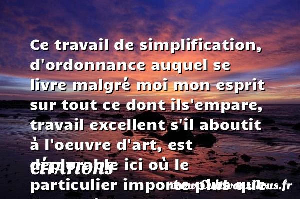 Ce travail de simplification, d’ordonnance auquel se livre malgré moi mon esprit sur tout ce dont ils’empare, travail excellent s’il aboutit à l’oeuvre d’art, est déplorable ici où le particulier importe plus que l’essentiel.
