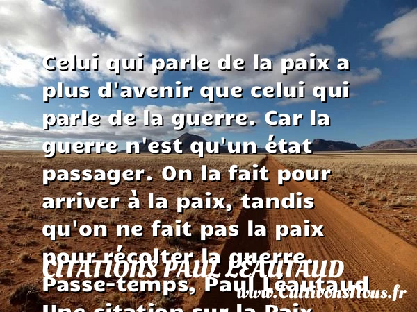 Celui qui parle de la paix a plus d’avenir que celui qui parle de la guerre. Car la guerre n’est qu’un état passager. On la fait pour arriver à la paix, tandis qu’on ne fait pas la paix pour récolter la guerre.