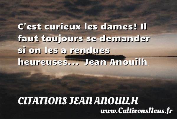 Evaluer cet article C'est curieux les dames! Il faut toujours se demander si on les a rendues heureuses… Jean Anouilh A lire On ne doit jamais battre une femme PARTAGER