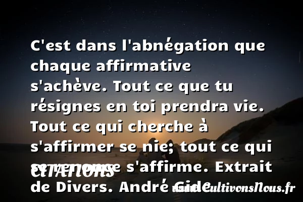 C’est dans l’abnégation que chaque affirmative s’achève. Tout ce que tu résignes en toi prendra vie. Tout ce qui cherche à s’affirmer se nie; tout ce qui se renonce s’affirme.