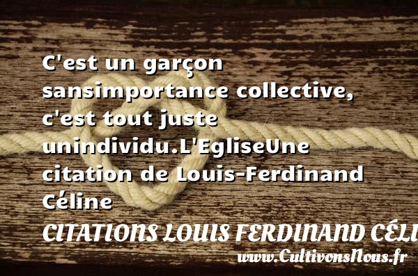 Evaluer cet article C’est un garçon sans importance collective, c’est tout juste un individu. L’Eglise Une citation de Louis-Ferdinand Céline A lire La beauté on sait que ça meurt PARTAGER
