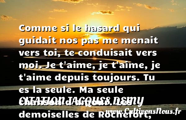 Comme si le hasard qui guidait nos pas me menait vers toi, te conduisait vers moi. Je t’aime, je t’aime, je t’aime depuis toujours. Tu es la seule. Ma seule chanson d’amour.