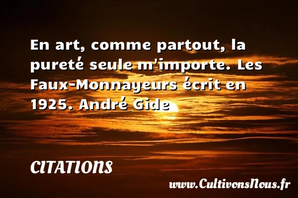 Evaluer cet article En art, comme partout, la pureté seule m’importe. Les Faux-Monnayeurs écrit en 1925. André Gide A lire Quand on voit la tristesse PARTAGER