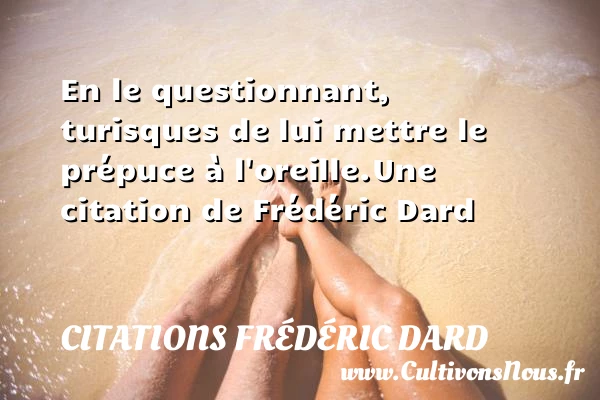 Evaluer cet article En le questionnant, tu risques de lui mettre le prépuce à l’oreille. Une citation de Frédéric Dard A lire L'honneur, c'est comme les PARTAGER