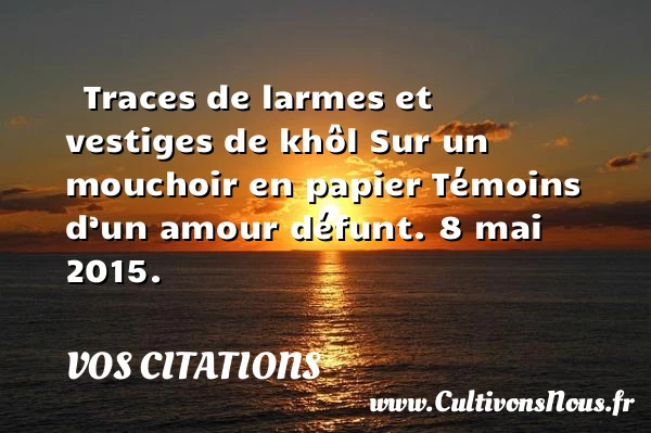 Evaluer cet article Traces de larmes et vestiges de khôl Sur un mouchoir en papier Témoins d’un amour défunt. 8 mai 2015. A lire Un gros bisous à nos fidèles fans PARTAGER