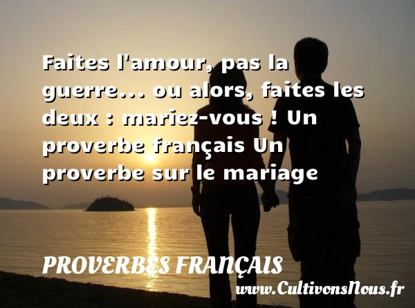 Evaluer cet article Faites l’amour, pas la guerre… ou alors, faites les deux : mariez-vous ! Un proverbe français Un proverbe sur le mariage A lire La vie n'a de prix que par PARTAGER Tags: Proverbes mariage