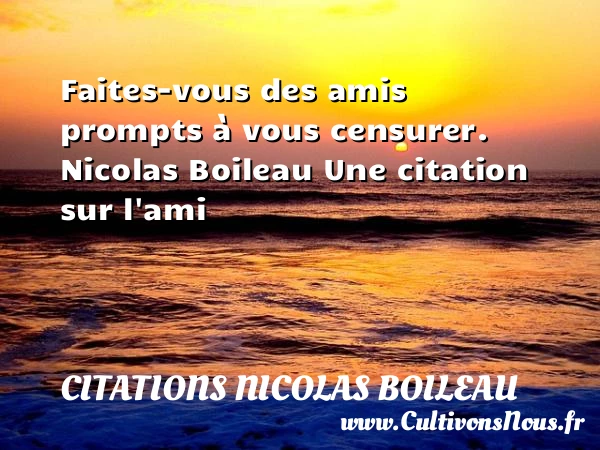 Evaluer cet article Faites-vous des amis prompts à vous censurer. Nicolas Boileau Une citation sur l’ami A lire Sans cesse on prend le masque PARTAGER Tags: Citation ami