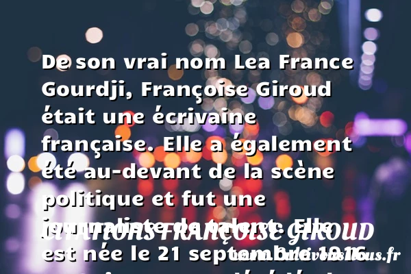 De son vrai nom Lea France Gourdji, Françoise Giroud était une écrivaine française. Elle a également été au-devant de la scène politique et fut une journaliste de talent. Elle est née le 21 septembre 1916 en Suisse et est décédée le 19 janvier 2003 à Neuilly-sur-Seine.