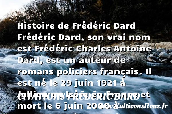 Frédéric Dard, son vrai nom est Frédéric Charles Antoine Dard, est un auteur de romans policiers français. Il est né le 29 juin 1921 à Jallieu en Isère en France et mort le 6 juin 2000 à Bonnefontaine de Fribourg en Suisse.