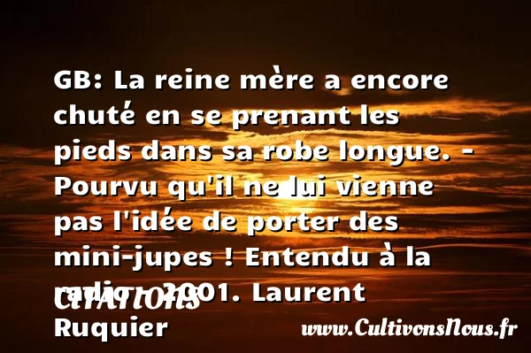 GB: La reine mère a encore chuté en se prenant les pieds dans sa robe longue. – Pourvu qu’il ne lui vienne pas l’idée de porter des mini-jupes !