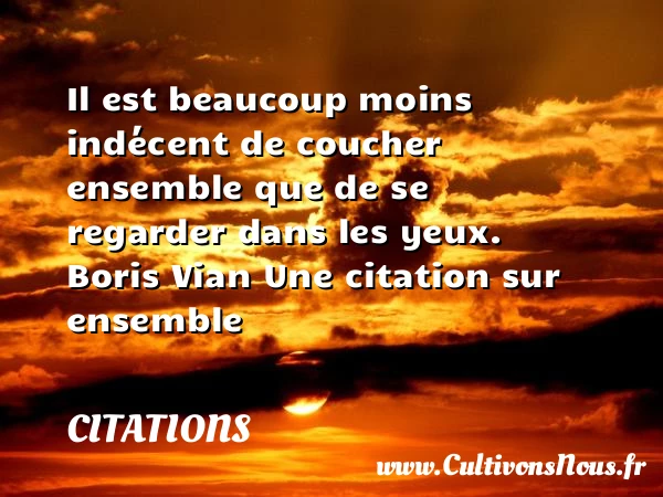 Evaluer cet article Il est beaucoup moins indécent de coucher ensemble que de se regarder dans les yeux. Boris Vian Une citation sur ensemble A lire Autant qu'il nous semble PARTAGER Tags: Citation ensemble