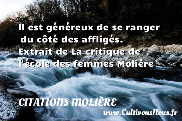 Evaluer cet article Il est généreux de se ranger du côté des affligés. Extrait de La critique de l'école des femmes Molière A lire S'il faut des soins et des PARTAGER