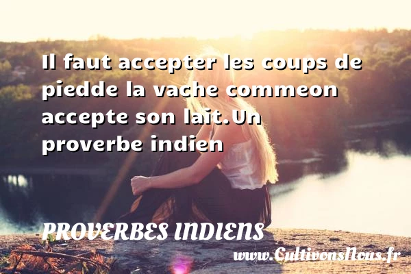 Evaluer cet article Il faut accepter les coups de pied de la vache comme on accepte son lait. Un proverbe indien A lire Qui regarde PARTAGER