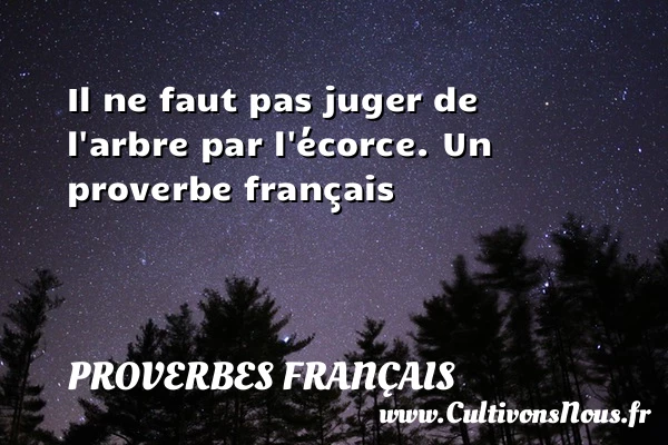 Evaluer cet article Il ne faut pas juger de l’arbre par l’écorce. Un proverbe français A lire Le jour du jugement PARTAGER Tags: Proverbe juger