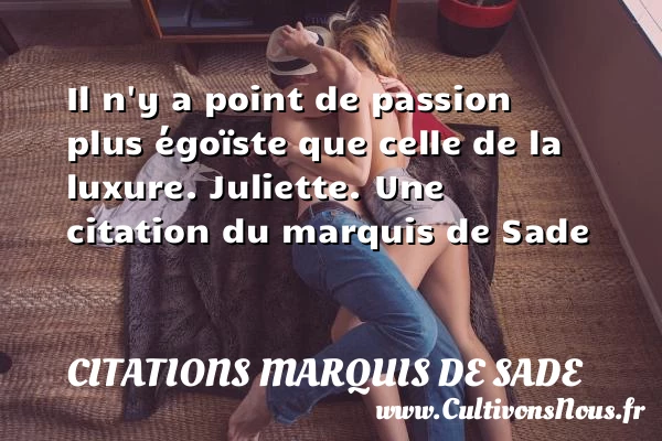 Evaluer cet article Il n’y a point de passion plus égoïste que celle de la luxure. Juliette. Une citation du marquis de Sade A lire C'est une chose très PARTAGER