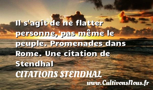 Evaluer cet article Il s’agit de ne flatter personne, pas même le peuple. Promenades dans Rome. Une citation de Stendhal A lire La beauté est une promesse PARTAGER Tags: Citation flatter