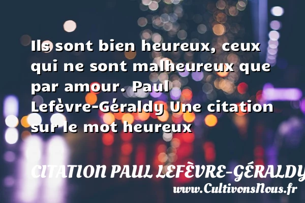 Evaluer cet article Ils sont bien heureux, ceux qui ne sont malheureux que par amour. Paul Lefèvre-Géraldy Une citation sur le mot heureux A lire Le plus grand bien que nous ait jamais donné l'amour, c'est PARTAGER Tags: Citations heureux