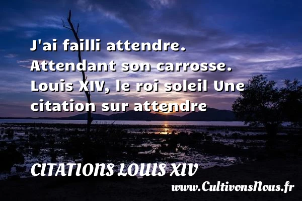 Evaluer cet article J’ai failli attendre. Attendant son carrosse. Louis XIV, le roi soleil Une citation sur attendre A lire Apprenez qu'un livre ne PARTAGER Tags: Citation attendre