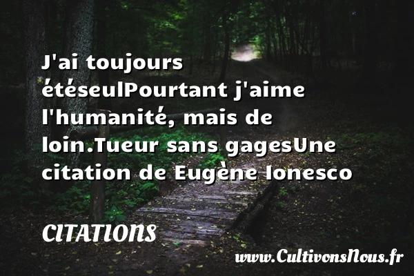 Evaluer cet article J’ai toujours été seulPourtant j’aime l’humanité, mais de loin. Tueur sans gages Une citation de Eugène Ionesco A lire L'univers de chacun est PARTAGER Tags: écrivain