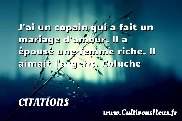 Evaluer cet article J’ai un copain qui a fait un mariage d’amour. Il a épousé une femme riche. Il aimait l’argent. Coluche A lire Il y a au moins un mariage PARTAGER Tags: Citations mariage
