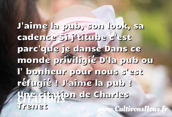 J’aime la pub, son look, sa cadence Si j’titube c’est parc’que je danse Dans ce monde priviligié D’la pub ou l’ bonheur pour nous s’est réfugié ! J’aime la pub !