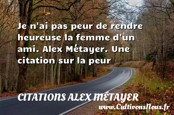 Evaluer cet article Je n’ai pas peur de rendre heureuse la femme d’un ami. Alex Métayer. Une citation sur la peur A lire Je le sauve de la peur. Ce n'est PARTAGER Tags: Citation peur