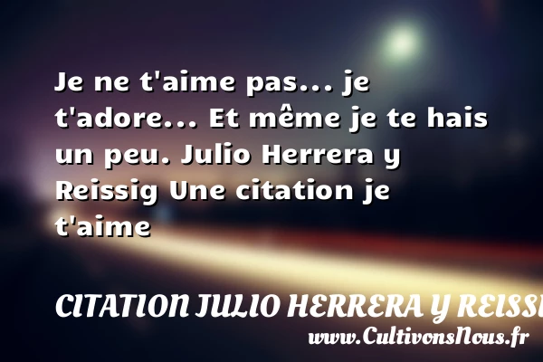 Evaluer cet article Je ne t’aime pas… je t’adore… Et même je te hais un peu. Julio Herrera y Reissig Une citation je t’aime A lire Celui-là seul connaît l'amour PARTAGER Tags: Citations je t aime