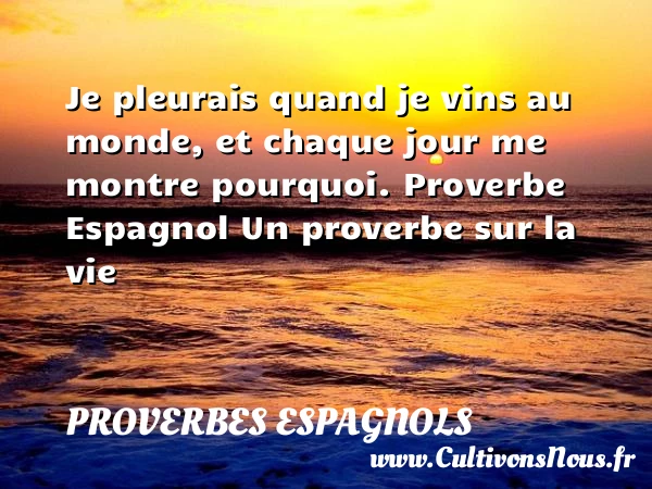 Evaluer cet article Je pleurais quand je vins au monde, et chaque jour me montre pourquoi. Proverbe Espagnol Un proverbe sur la vie A lire Le sort est tout-puissant, PARTAGER Tags: Proverbes vie