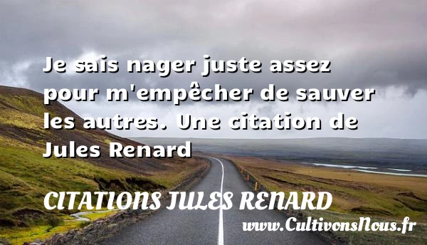 Evaluer cet article Je sais nager juste assez pour m’empêcher de sauver les autres. Une citation de Jules Renard A lire On ne fait jamais ce qu'on PARTAGER Tags: Citation juste
