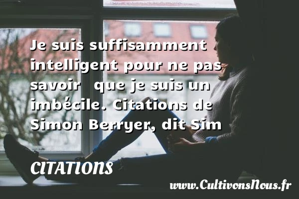 Evaluer cet article Je suis suffisamment intelligent pour ne pas savoir que je suis un imbécile. Citations de Simon Berryer, dit Sim A lire Ouuuh ! Là.... Je sens mes PARTAGER Tags: humoriste